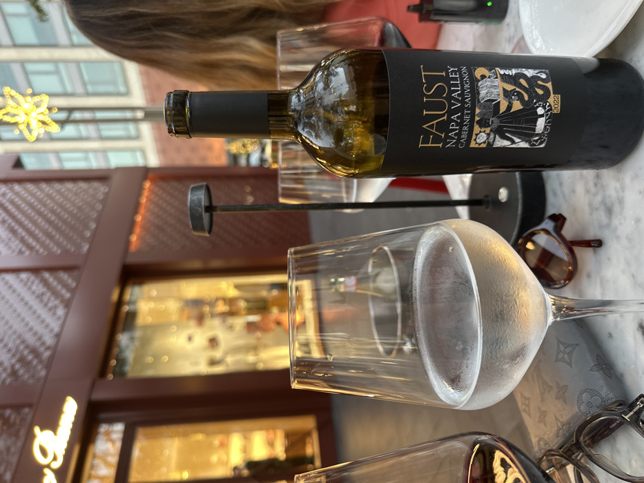 A bottle of Faust Napa Valley Cabernet Sauvignon 2022 rests horizontally on a wine rack alongside a stemmed glass, its surface beaded with condensation. The rack has a dark finish, contrasting with a light-colored marble-like surface. Sunglasses and eyeglasses are nearby. The background features a partially visible building exterior with a decorative, gold-toned starburst hanging from a light. The building has large windows displaying interior items.