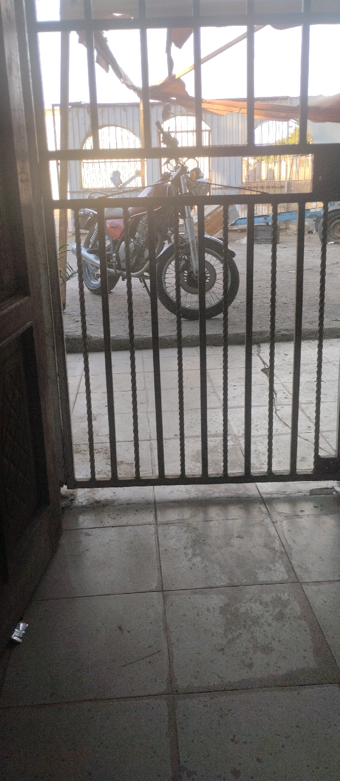 The image displays an exterior scene in Altagracia, Venezuela, captured through a dark metal security gate from an interior vantage point. The foreground reveals a square-tiled, grey floor, appearing worn with visible dirt and stains. To the left, a dark wooden door frame is partially visible. The prominent metal security gate, equipped with vertical bars, some featuring a twisted design, obstructs and frames the view of the outside. Beyond the gate, an unpaved, light-colored dirt ground is visible. A red and black motorcycle is parked on this ground, oriented slightly to the left, with its front wheel, engine assembly, and rear wheel clearly discernible. In the mid-background, a light-colored building with corrugated metal siding is present, featuring two arched windows protected by bars. Above this structure, a brightly illuminated, possibly overexposed, sky dominates. To the right, a tattered reddish-brown tarp or awning structure is visible. Further right, indistinct industrial elements, including what appears to be part of a blue vehicle or machinery and a fence with minimal vegetation, are discernible. No individuals, actions, or interactions are visible within the frame. The scene is illuminated by natural daylight.