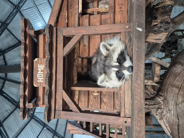 - "The image displays a raccoon peeking from a multi-tiered wooden structure, likely an animal enclosure, located indoors in Thôn 5, Vietnam" by FM-vOprn2, licensed under CC BY 4.0