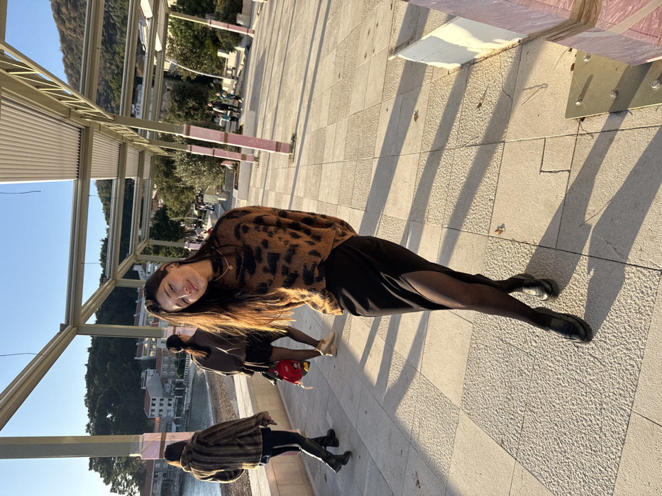 The image captures an outdoor paved promenade in Donji Katun, Montenegro, illuminated by strong, low-angle sunlight. In the foreground-right, a young adult female, approximately 20-30 years old, stands angled towards the camera, exhibiting a slight smile with closed eyes. She has long, dark hair and is dressed in a brown and black leopard-print long-sleeve sweater, a black high-slit midi skirt, sheer black tights, and black loafers. Her right leg is positioned slightly forward, crossing her left. In the midground-left, two other females are observed walking away from the camera. The leftmost individual wears a brown fur-textured jacket, black leggings, and black knee-high boots. The central figure is dressed in a dark long-sleeve top, black shorts, sheer black tights, and light-colored shoes, carrying a red shoulder bag adorned with a yellow circular character emblem. The environment features a light-colored, textured tiled walkway. Overhead, a metallic pergola structure extends, with some of its vertical support columns wrapped in pink material. To the background-left, a bay with a pebbled beach is visible, bordered by white buildings featuring red roofs, situated at the base of tree-covered hills. To the background-right, a multi-tiered concrete walkway ascends, populated by several indistinct pedestrian figures. Long, distinct shadows are cast across the promenade from the left.