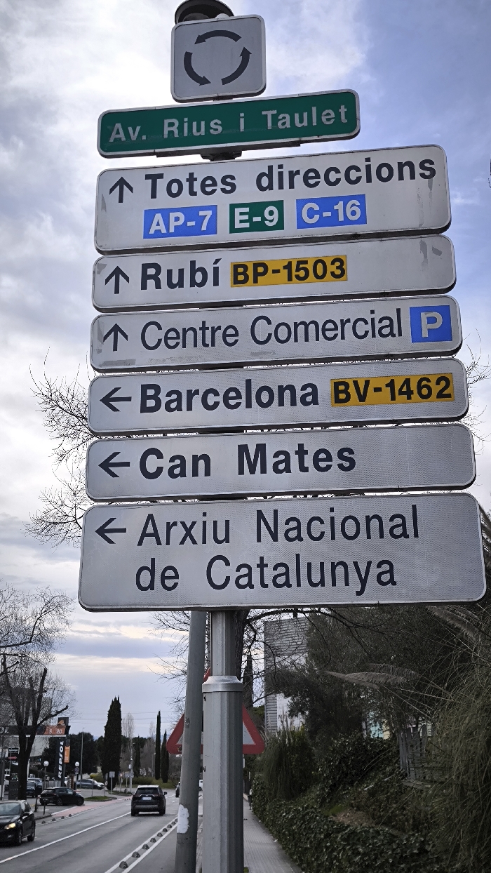stack of road signs. The topmost sign indicates a roundabout. Below it, signs direct traffic to "Av. Rius i Taulet," "Totes direccions," "Rubí BP-1503," "Centre Comercial," "Barcelona BV-1462," "Can Mates," and "Arxiu Nacional de Catalunya." Several signs also include road numbers: AP-7, E-9, C-16, and BP-1503. One sign features the letter "P" in a blue box, indicating parking. The signs are mounted on a metal pole. A road, sidewalk, and sparse vegetation are visible in the background.
