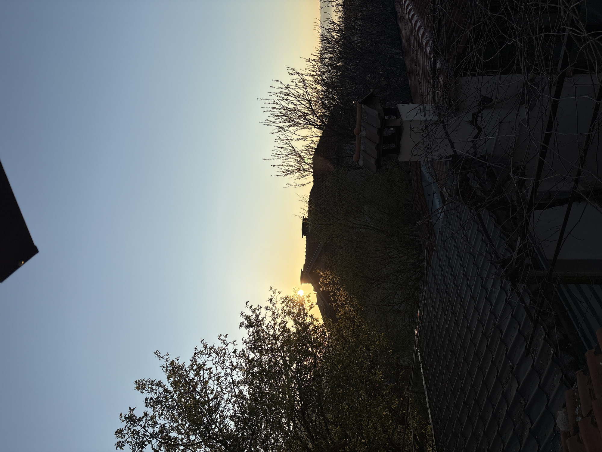 - "The image depicts a low-angle view towards the sky, with trees, rooftops, and a chimney silhouetted against the bright light, likely the setting sun or dawn" by FM-6ldul2, licensed under CC BY 4.0
