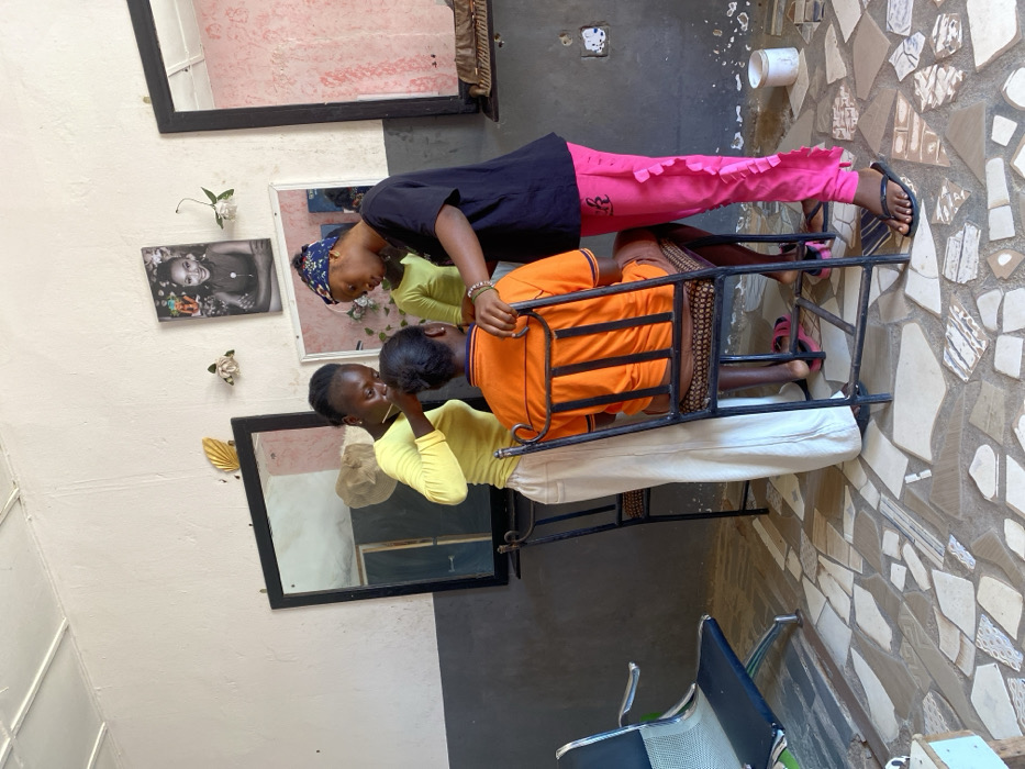 An interior view of a hair salon in Sabon Gari Nassarawa, Nigeria, depicts three individuals engaged in hair styling