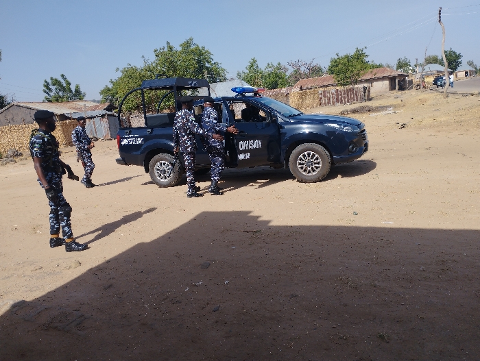 The scene takes place on a dirt road in the town of Chum, Nigeria, located at coordinates 9.706 latitude and 11.714 longitude. A dark blue pickup truck, emblazoned with "DIVISION POLICE" on the side, is parked on the right side of the road. Three men wearing dark blue and grey uniforms are standing around the vehicle, interacting with each other. A fourth man, also wearing a dark blue and grey uniform, stands on the opposite side of the road, looking towards the truck. There is a dry, sandy environment with scattered vegetation, and several buildings are visible in the background. The sky is a clear blue.