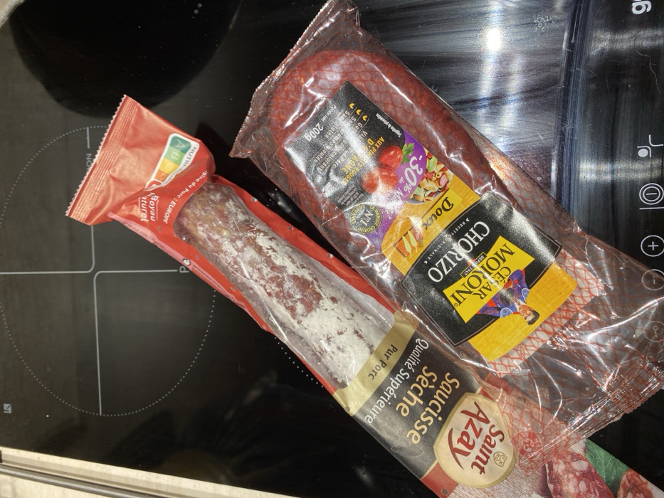 - "Two packaged dried sausages are depicted resting on a black, glossy induction stovetop in Bonnieux, France" by FM-5pNq53, licensed under CC BY 4.0