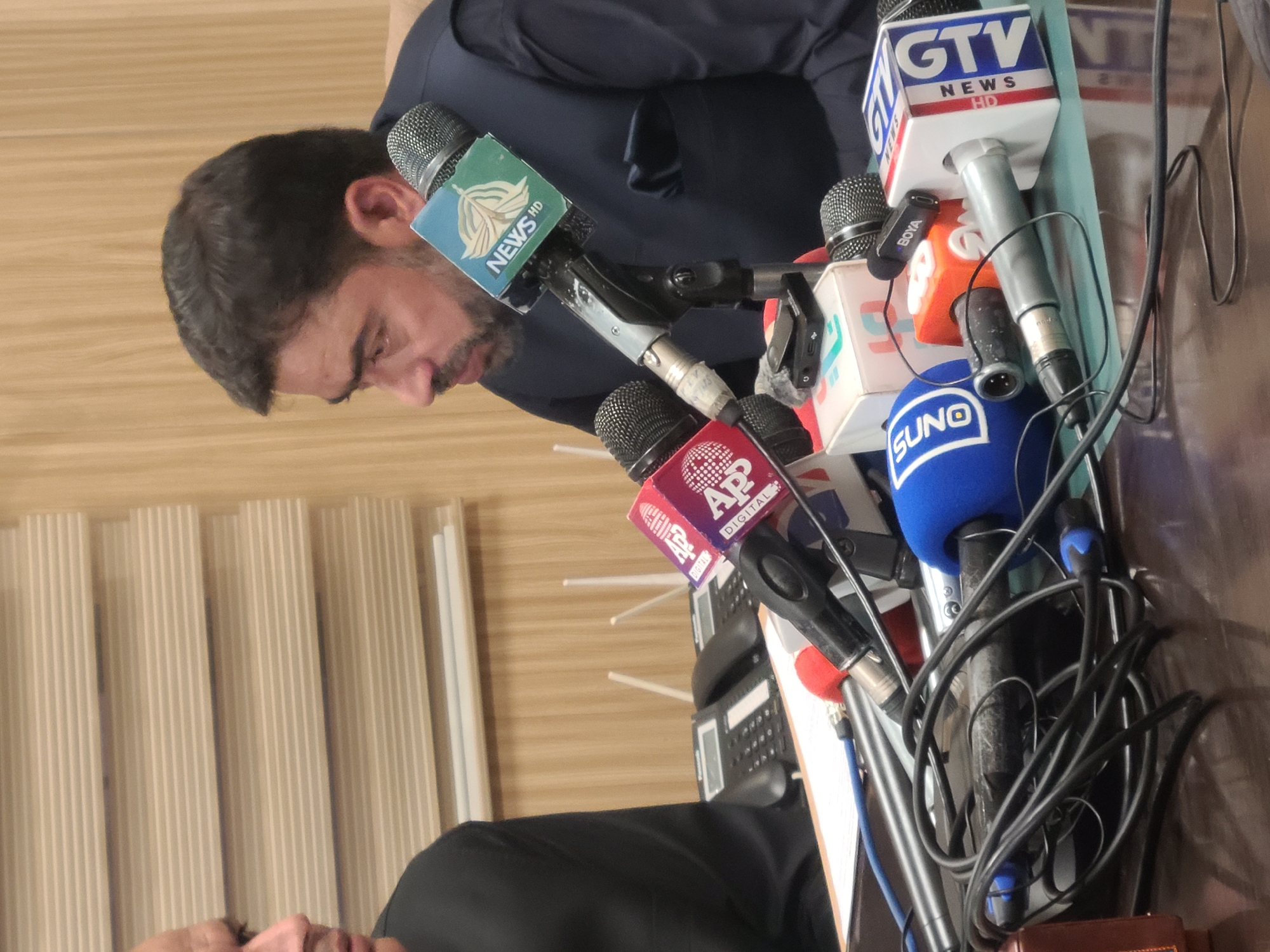 A man is standing behind a collection of microphones from various news organizations. The logos visible on the microphones include "GTV News HD", "News HD", "AP Digital", and "SUNO". The location is likely Quetta City Tehsil, Pakistan. The setting appears to be a press conference or media event. The individual is wearing a dark shirt. Additional details are difficult to discern due to the angle and the focus on the microphones. There are phones on the table. A folding screen is visible behind the man.