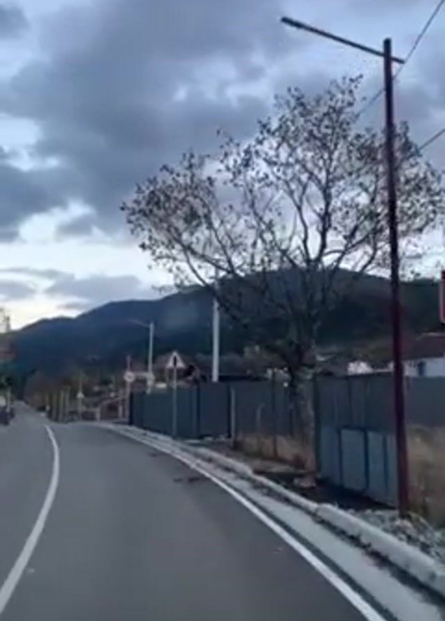 A static camera shot depicts a curving asphalt road in a rural area under a cloudy sky. The road is lined with a white stripe marking the edge and features a gray fence running alongside it, beyond which are houses and trees. In the distance, mountains can be seen. Road signs are visible near the curve, and utility poles with wires stretch across the sky. The overall scene suggests a quiet residential area on a partly overcast day.