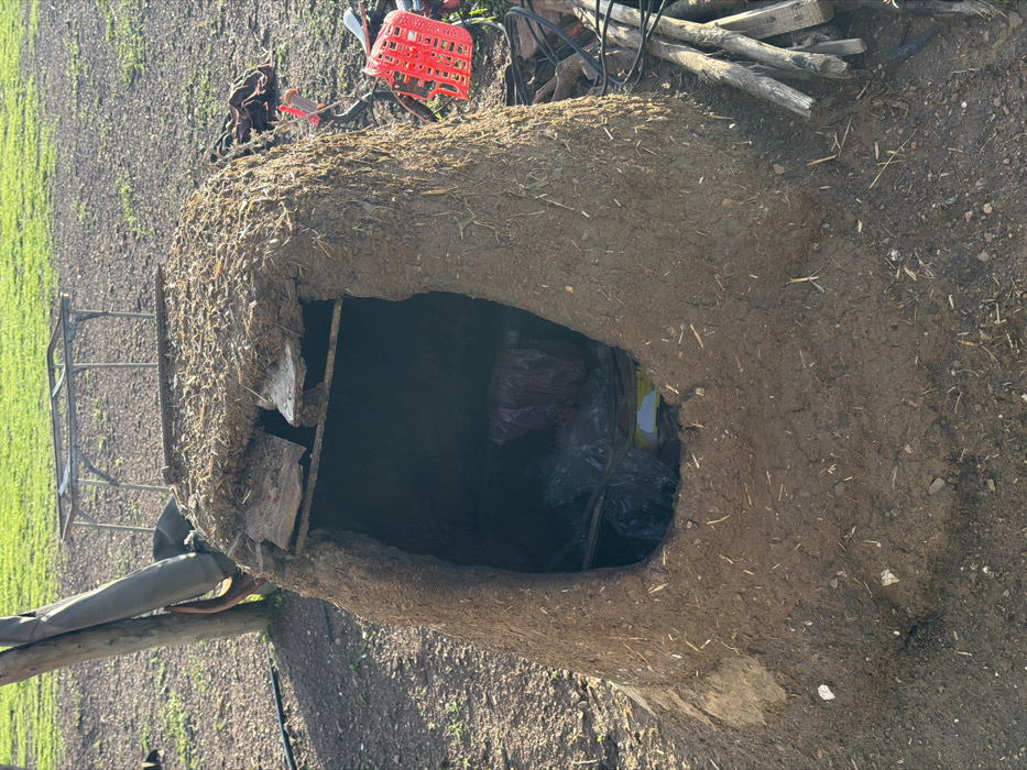 A rustic, earthen structure with a wide, arched entrance sits on bare ground next to a field. The structure is made of mud and straw. Inside, plastic bags and other items are visible in the shadows. A metal ladder leans against the left side. Debris such as a red plastic crate, wood planks, and electrical wires clutter the area behind the structure. The scene suggests a rural or agricultural setting.