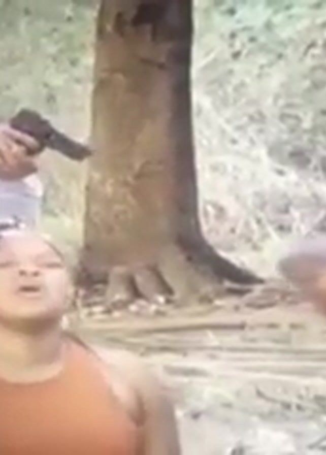 The scene depicts a tense situation in what appears to be an outdoor setting with trees and greenery. A man is holding a gun and aiming it towards a woman who is looking upwards and yelling in distress. Another man stands nearby with his hands on his head, seemingly in a state of fear or surrender. In the background, a fourth person stands, possibly law enforcement, as he is wearing a vest and holding a weapon.