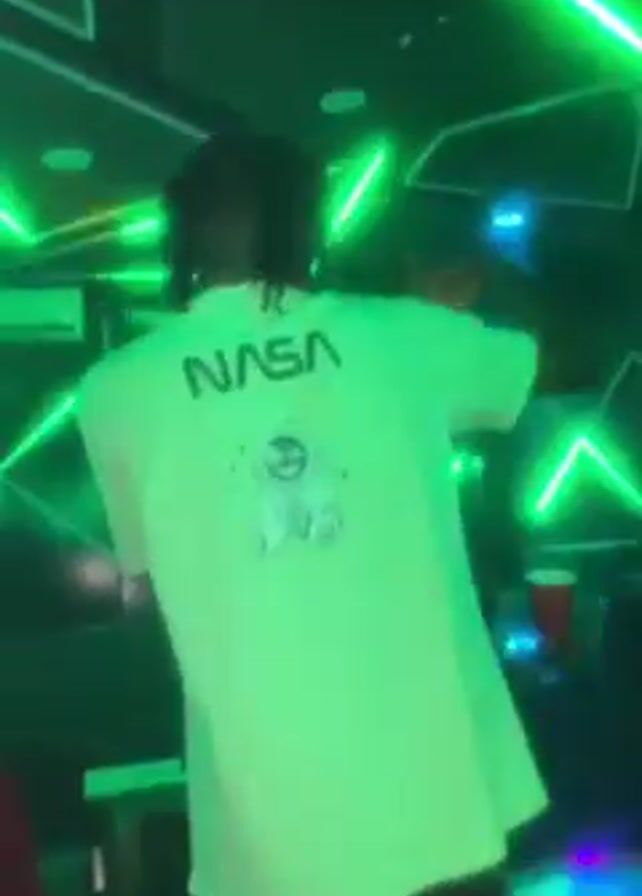 A person wearing a light yellow NASA t-shirt dances in a room with laser lights. The lights are predominantly green and blue, creating geometric patterns on the ceiling. Other people are visible in the background, partially obscured by the lighting. There are red cups and a black trash can in the periphery. The video is somewhat shaky, indicating it was likely handheld. The person is the primary focus, moving their arms and body to music.