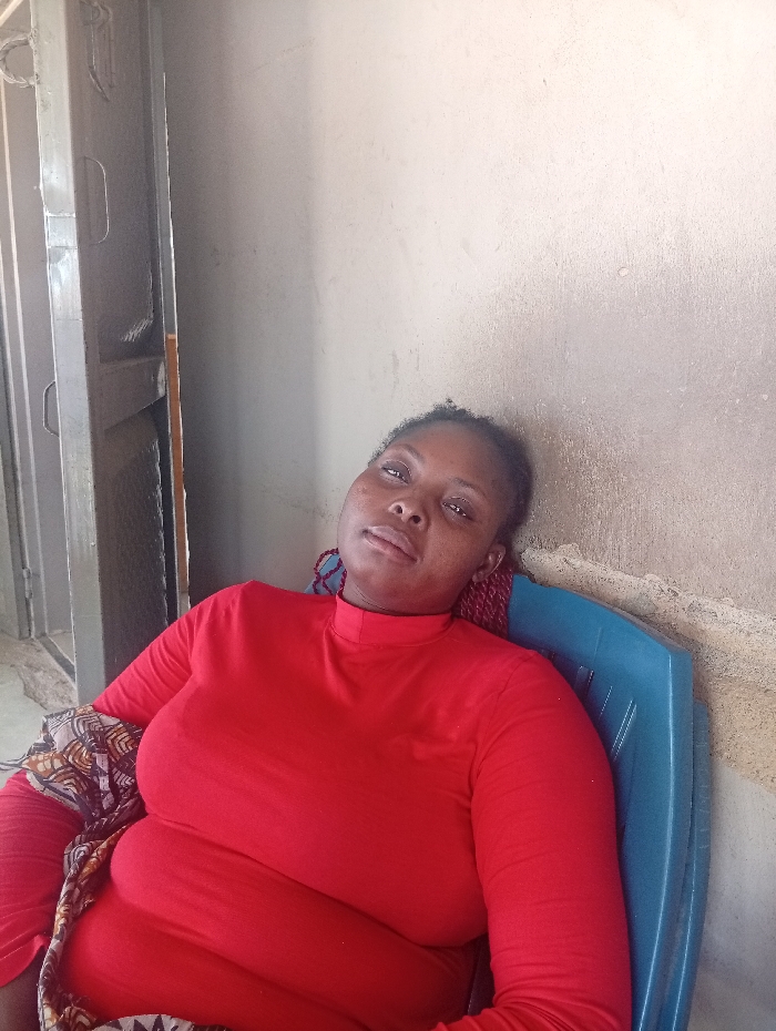 A single adult female is depicted seated in what appears to be an indoor or sheltered environment. She is positioned on a blue plastic monobloc chair, leaning against a light-colored, textured wall. To the immediate left of the frame, a dark, vertical metallic structure, possibly a door frame or support beam with visible hardware, is partially visible. The woman has dark, short, curly hair and is wearing a long-sleeved, high-necked red top or dress. A patterned fabric, featuring geometric or abstract designs in multiple colors, is draped over her left arm and across her lap. Beaded earrings are visible on her left ear. Her head is slightly tilted back, and her eyes are open, looking upward and forward with a relaxed or neutral expression. The scene is illuminated by ambient light, producing soft shadows. The precise location within the city of Jos, Nigeria, cannot be identified from the visual content of the image.