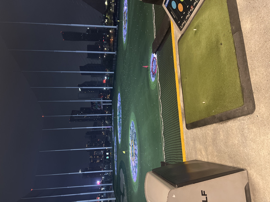 An indoor Topgolf bay, rotated horizontally, shows a green driving range with targets against a backdrop of city buildings at night