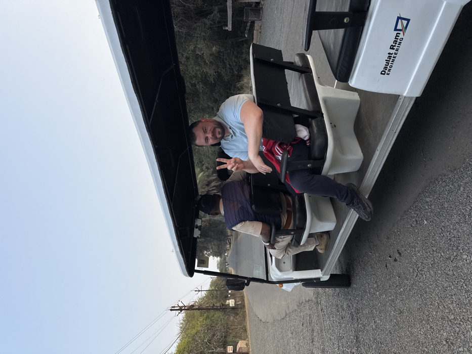 The image captures two adult males riding in an open-sided electric vehicle on a graveled road, set against a backdrop of dense foliage and a clear sky in Bhopal, India. **Location:** The scene is situated within an outdoor area of Bhopal, India, potentially a large park, campus, or wildlife sanctuary like Van Vihar National Park, given the natural setting and type of vehicle. Utility poles with power lines are visible along the road. The vehicle prominently displays the logo "Daulat Ram ENGINEERING," an Indian company. **Subjects:** 1. **Driver:** An individual of South Asian descent is seated in the front-left seat, observed from the rear. He wears a light-colored, possibly khaki, uniform consisting of a shirt and trousers, complemented by a dark blue sleeveless puffer vest and a brown belt. 2. **Passenger:** A Caucasian male is seated in the middle-right seat, facing the camera. He has short dark hair and a beard, and is smiling. His right hand is raised, forming a "peace" sign. He is dressed in a light blue short-sleeved polo shirt, dark blue athletic trousers, and dark grey athletic shoes. A red and white striped garment is draped on the seat next to him. **Objects:** * **Vehicle:** A white electric shuttle or golf cart-style vehicle with a black canopy roof and black cushioned seats. The "Daulat Ram ENGINEERING" logo is visible on its right side. * **Road:** A gray, gravel-strewn road extends into the distance, slightly curving to the left. * **Utility Poles:** Multiple dark utility poles with overhead power lines are visible along the left side of the road. **Environment:** The road is bordered on both sides by thick vegetation, including trees and bushes, some appearing green and others drier. The sky above is clear and light blue, indicating daylight conditions. **Actions/Interactions:** The passenger is directly facing and smiling at the camera, making a peace sign, suggesting a deliberate pose for a photograph. The driver is seated in a position typical for operating the vehicle, facing forward.