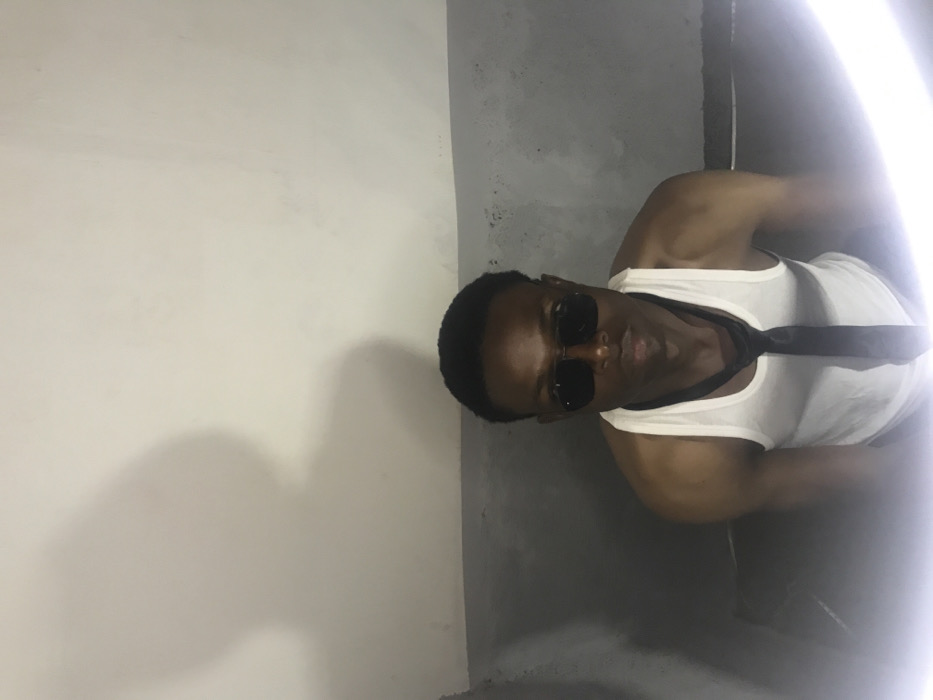 The scene is set indoors in the city of Kirana, Nigeria. A male individual, appearing to be of African descent, is centrally positioned and faces directly towards the camera. He wears dark, rectangular sunglasses that obscure his eyes, and a white ribbed tank top. A dark necktie hangs loosely around his neck, extending down the front of his tank top without being formally tied. His hair is short and dark. He is positioned against a wall that is vertically divided into two distinct sections: an upper section of light grey or off-white, and a lower section of darker grey. A faint, dark shadow, consistent with a human profile, is visible on the upper left portion of the light-colored wall. The foreground is partially obscured by a bright, arc-shaped light source, creating a soft glow at the bottom of the image. The overall lighting suggests an artificial source, casting strong contrast.