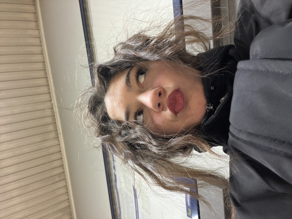 A young woman poses with pursed lips, her gaze directed upwards. She has wavy, light brown hair and wears a black jacket. The background includes a wall with horizontal lines and a digital screen displaying text and graphic elements. The overall composition suggests a candid or selfie-style photograph, with a casual and slightly tilted perspective.