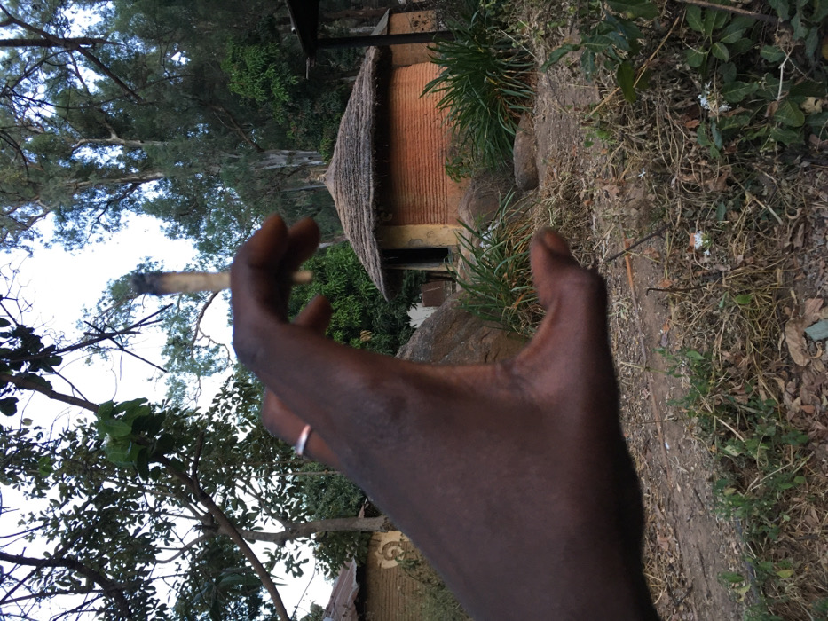 A dark-skinned hand holds a lit cigarette or joint, a silver ring on a finger. Behind the hand, a small, round, red-brick structure with a thatched roof sits nestled among rocks and green foliage. The building appears to be in a natural setting, possibly a garden or rural area. Trees and shrubs provide a backdrop, while dry leaves and dirt cover the ground in the foreground. The image is slightly tilted.