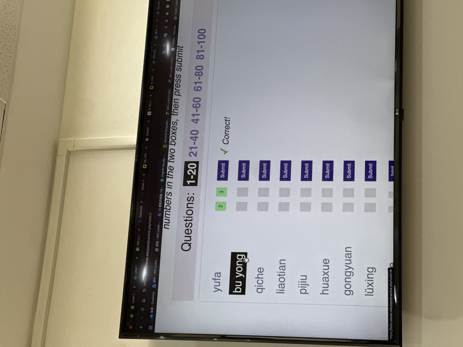 A close-up shot of a computer screen showing an online quiz. The quiz asks users to select numbers in two boxes and then press submit. The question is about numbers in the range of 1-20, and the possible answers are in Chinese, including “yufa”, “bu yong”, “qiche”, “liaotian”, “pijiu”, “huaxue”, “gongyuan”, and “lüxing”. One question is marked as correct. The screen also shows various tabs and browser-related items.