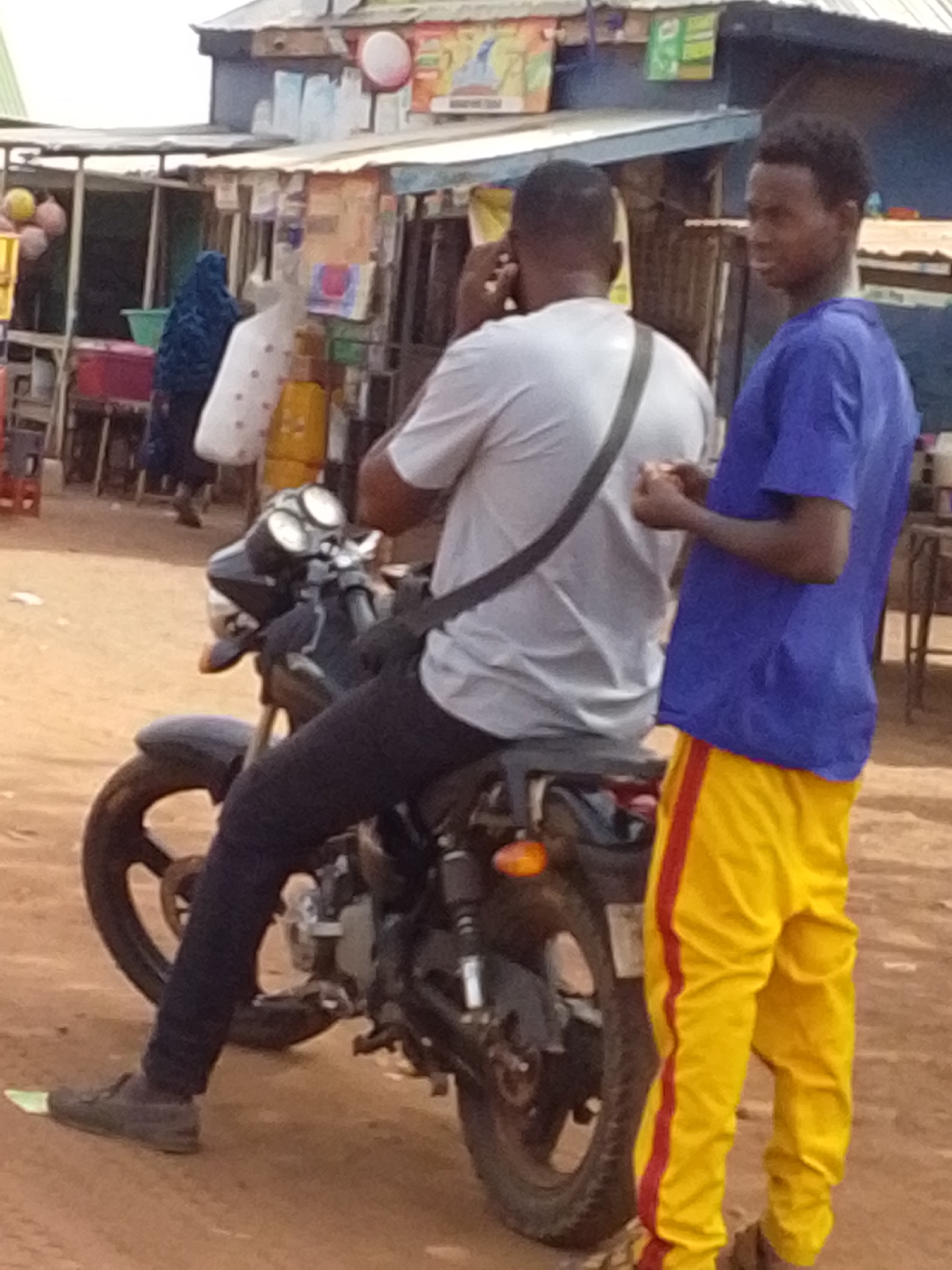 two men and a parked motorcycle in Dungu, Ghana. One man is seated on the motorcycle, wearing a light gray T-shirt, dark pants, and brown shoes; he appears to be on a cell phone call. A black strap is visible across his chest. The second man stands beside the motorcycle; he is wearing a blue T-shirt and yellow track pants with red stripes down the side. The motorcycle is black. In the background, there are buildings and people, suggesting a street or market scene.