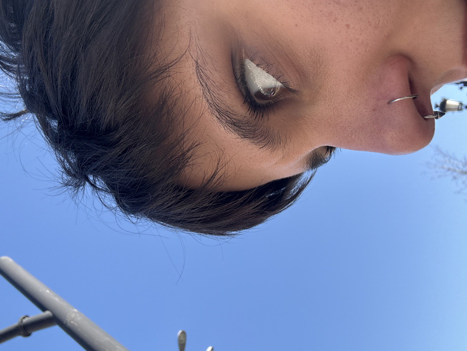 A close-up, low-angle forensic image captures the right side of an individual's face against a clear blue sky background in Sofia, Bulgaria. The subject's dark, short hair frames the upper forehead and eyebrow. The right eye, with a visible brown iris, is directed upwards and to the right, reflecting bright light. The nose features two silver-colored hoop piercings: one through the nostril and another through the septum, visible from the side. The skin tone appears even with some minor texture. In the blurred background, a dark grey cylindrical pole is visible in the upper left, alongside faint, out-of-focus elements that suggest bare tree branches and a street lamp, indicating an outdoor urban environment under bright daylight conditions. No specific actions or direct interactions are discernible beyond the subject's upward gaze.