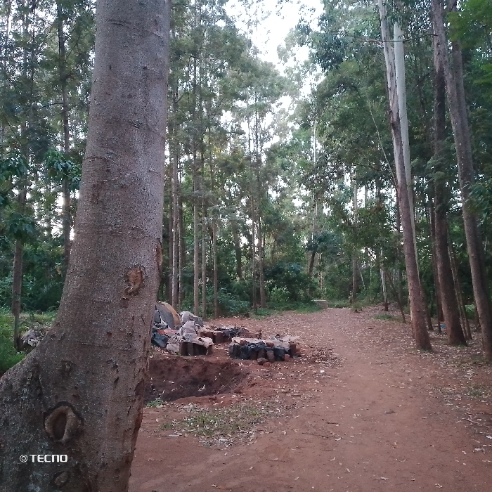 A dirt path winds through a forest of tall, thin trees, some with smooth, light bark and others with rough, darker bark. In the foreground, a large tree trunk dominates the left side of the frame. Next to it, a collection of rocks and dug-out pits are visible. The path leads into the distance, partially obscured by the density of the trees. The light is subdued, suggesting either early morning or late afternoon.