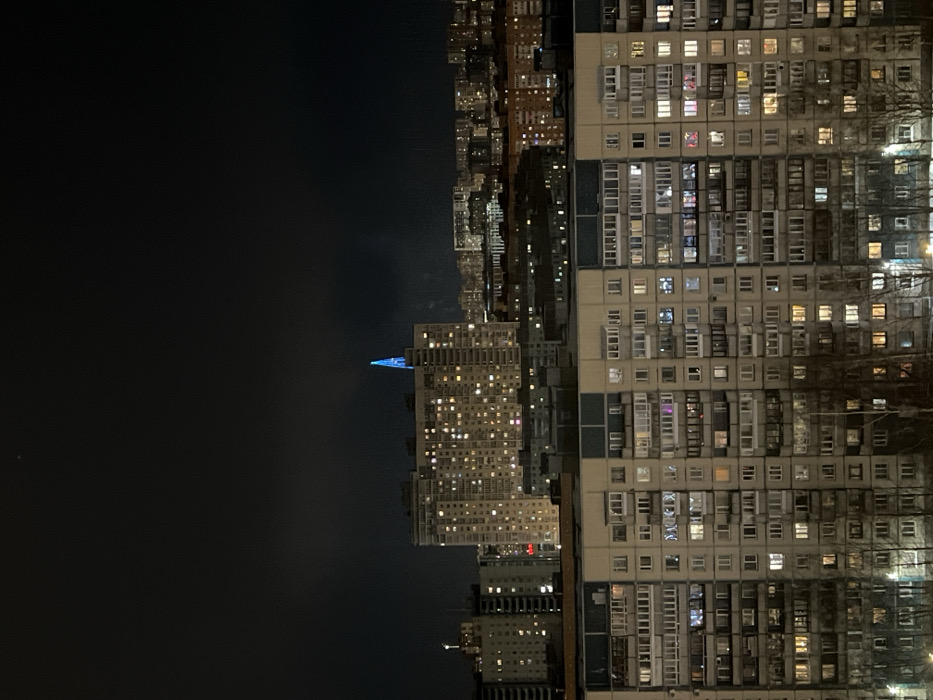 A night cityscape features densely packed buildings illuminated with numerous lights. The buildings vary in height and architectural style. In the foreground, a large, white building with many windows dominates the view. A skyscraper with a distinct blue-lit spire rises among other structures. The sky is dark, with a few clouds visible near the blue-lit skyscraper. The image is taken from an elevated perspective.