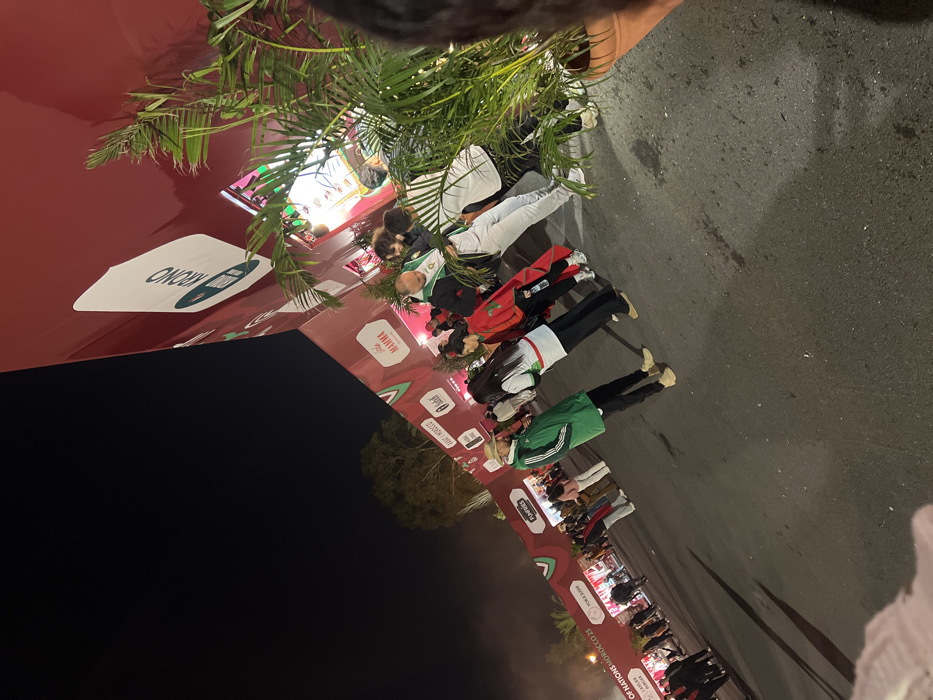 A nighttime scene shows a group of people standing in front of a banner with "Nations Morocco 2025" written on it. The banner is decorated with palm trees. The people are dressed in a mix of casual and athletic wear. Some wear green jackets or Moroccan flag attire. The setting appears to be outdoors, possibly at an event or gathering. The image is taken at an unusual angle, with a partial view of someone's head in the upper frame.