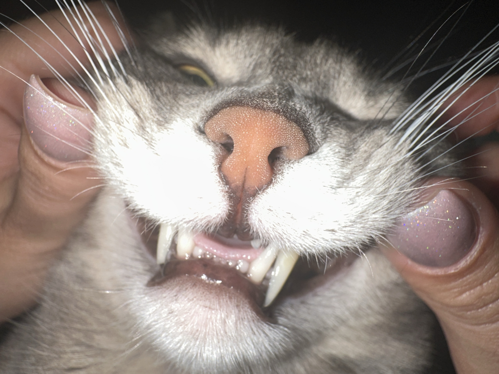 A close-up photograph captures the head of a domestic cat, described as being from Vratsa, Bulgaria. The subject is a short-haired feline with gray and white tabby markings. Its mouth is held open by two human hands, revealing its full dentition. Four prominent, sharp, yellowish-white canine teeth are visible, along with smaller white incisors. The cat's pink gums and a portion of its tongue are exposed, with visible moisture. Its pink nose is centered, and one yellow eye is partially visible, appearing squinted. Numerous long, white whiskers extend horizontally from the muzzle. The hands, likely belonging to one individual, are pressing on the cat's cheeks to pull back the fur and skin. The visible thumbnails on both hands exhibit a light pink manicure with iridescent glitter particles. The background is uniformly dark and out of focus, providing no additional environmental details.