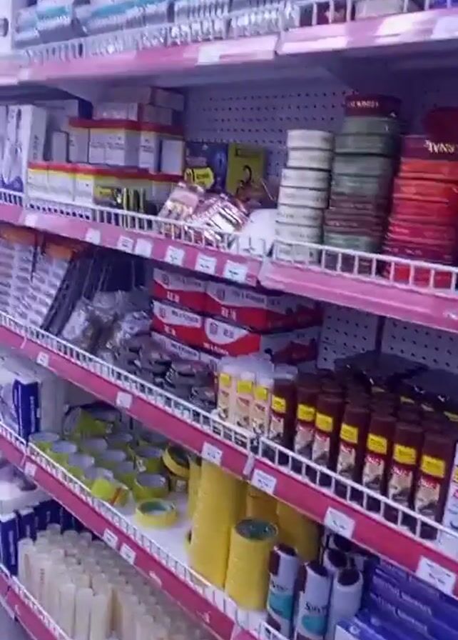 A slow pan across a set of shelves in a store is depicted in the video. The shelves are filled with various products, including boxes, cans, and rolls of tape. The shelves are white with red trim. The store appears to be well-stocked and organized. There is indistinct talking in the background.