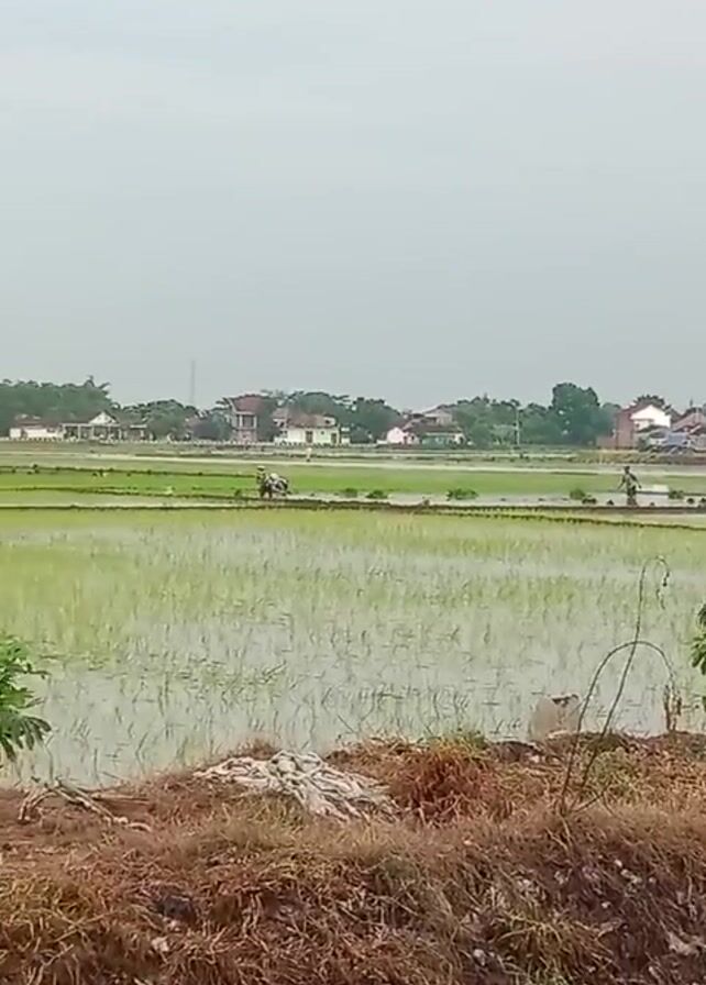 A vertical shot depicts a lush rice paddy field under an overcast sky. In the distance, the outlines of houses and buildings dot the horizon. Two human figures are visible amidst the greenery of the rice paddy, engaged in agricultural work. The foreground consists of a patch of dry, brown vegetation, with a small green tree standing to the right. Some trash is scattered on the ground in the foreground.