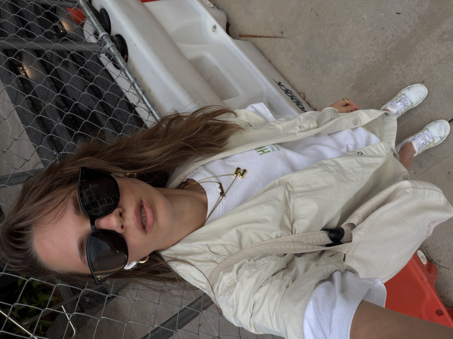 An adult female is depicted in a self-portrait style photograph, standing outdoors in an urban environment. She has medium-length brown hair and is wearing large, dark sunglasses, under which her lips are slightly parted. White wireless earbuds are present in both ears, and she wears gold hoop earrings. Around her neck are two gold necklaces, one with a bar-shaped pendant and another with a prominent gold "M" pendant. She is dressed in a white short-sleeved t-shirt featuring a partially visible green graphic that includes "HI" and additional text below. Over the t-shirt, she wears a light beige or cream-colored utility jacket/overshirt with pockets and snap buttons. A matching light beige tote bag is slung over her left shoulder, with a black accent on the strap. On her right ring finger, a gold ring is visible. Her footwear consists of light-colored athletic shoes with purple laces. She stands on a light-colored concrete surface. To her left, an orange element is visible near the ground. To her right and behind her, white plastic water-filled barriers are present, one of which clearly displays the black text "YODOCK" on its lower section. Behind the barriers and the subject, a metal chain-link fence is visible. The reflection in her sunglasses shows a building with windows, suggesting a developed area. The scene is located in an urban area of Fort Lauderdale, United States of America, specifically near what appears to be a construction or event zone, indicated by the YODOCK brand barriers. The lighting is diffused daylight, suggesting an overcast condition or indirect sunlight.