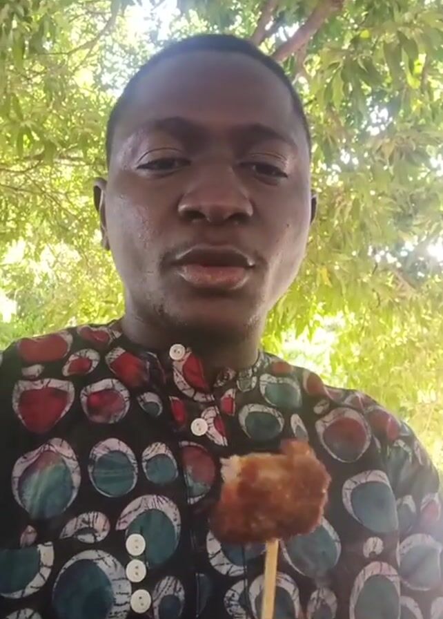 A close-up shot shows a dark-skinned man outdoors during the day. He is wearing a dark collared shirt with a colorful pattern of red, white, and green circles. The man is holding a small piece of food on a toothpick. He raises the toothpick to his mouth and eats the food. The background features a tree with green leaves and bright sunlight filtering through the branches.