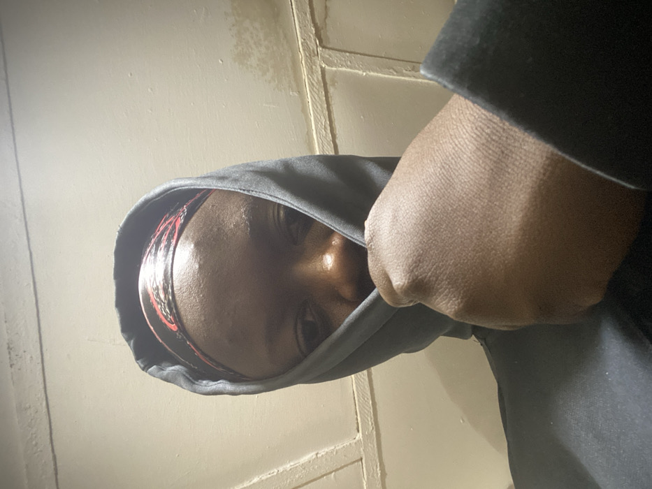 A person peers out from a grey hooded sweatshirt. A patterned headscarf peeks from under the hood. The person's right hand holds the hood close to their face. The background is a beige wall with visible seams. The image is angled, giving the impression the person is looking down.