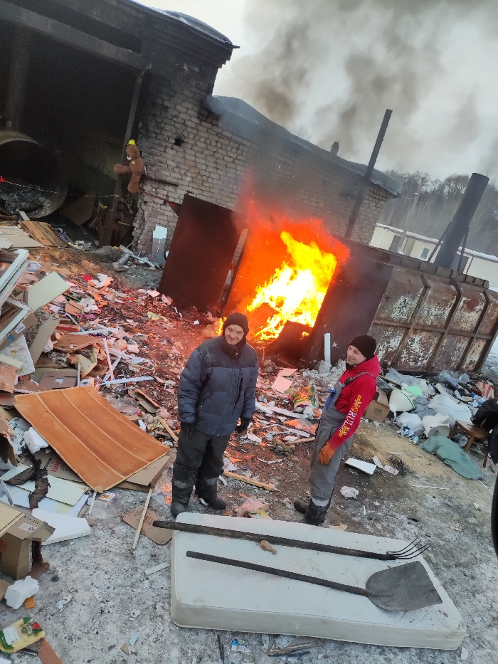 This image depicts an outdoor scene in Ol'khovskoye, Russia, characterized by an active fire, two individuals, and significant debris under overcast, cold conditions with snow/ice on the ground. In the foreground, a white mattress lies flat on the snow-covered ground. Placed on the mattress are two long-handled tools: a black-bladed shovel and a dark-pronged pitchfork. To the left of the mattress, various pieces of refuse, including cardboard boxes, fragments of wood, and white foam, are scattered. Two adult males stand facing the camera in the mid-ground. The male on the left wears a dark beanie, a dark blue padded winter jacket, dark pants, and dark boots; he displays a slight smile. The male on the right wears a black beanie, a red long-sleeved shirt with white text, light grey overalls, and dark boots; he is looking towards the camera's right with a slight smile. Behind the individuals, a significant fire burns with intense orange flames, emanating from an opening in what appears to be a large, rusty metal container or a partially obscured structure. Thick, dark grey smoke billows upwards from this fire. To the left of the main flames, a brick building with a damaged section is visible. A brown stuffed bear with a yellow cap hangs from a vertical support beam near the building's damaged area. Inside a dark opening on the left side of this building, a large, cylindrical metal object is partially visible. Further to the right, behind the primary fire source, another large metal container and a tall, dark pipe or chimney-like structure are discernible. The ground in the mid-ground and background is heavily littered with various types of waste, including plastics, cardboard, and construction debris. Trees are visible on the distant horizon under an overcast sky.