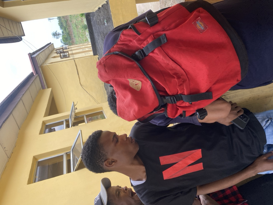 The image captures three individuals outdoors in Ihiagwa, Nigeria, positioned in front of yellow-painted buildings. In the foreground, a young adult male with short dark hair is visible, turned slightly to his right and looking downwards. He wears a black t-shirt featuring a large red "N" (Netflix logo) and light blue jeans. A dark-colored smartphone is held in his right hand, tucked into his front pocket. To the right of this individual, another person is seen from behind, largely obscured by a prominent red Dickies brand backpack with black straps and buckles. This person wears a dark blue garment, and their head is bent forward, hidden by the backpack. Partially visible on the far left, behind the central figure, is a third individual wearing a grey cap and a plaid shirt, with their mouth open in an expression or speech. The background consists of two yellow-painted buildings with brown roof overhangs. The closer building on the left features two windows with light-colored frames, both partially open outwards from the bottom. The second building, further back on the right, has multiple metallic units (possibly air conditioners) mounted on its side. Beyond the buildings, a sloped green landscape with a single palm tree is visible against an overcast sky. A dark, flat surface is present between the buildings and the distant landscape.