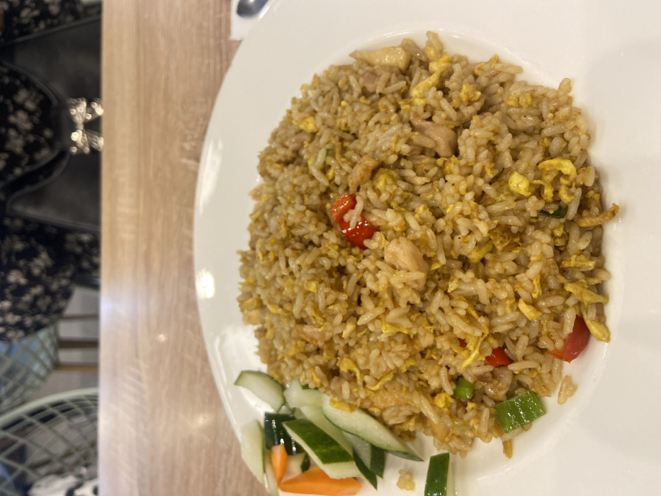 The image displays a close-up, slightly elevated perspective of a meal served on a light-colored wooden table in an indoor environment. The central object is a white, round plate containing a portion of Nasi Goreng (Indonesian fried rice). The fried rice is characterized by its golden-brown color, interspersed with visible yellow scrambled egg pieces, pale chicken chunks, bright red chopped chili peppers, and green scallions. To the left of the fried rice, a garnish of sliced green cucumbers and orange carrots is neatly arranged. In the background, behind the table, a person is partially visible and out of focus, wearing a dark fabric with a light floral or patterned design. A black handbag with a metallic, possibly silver-toned, decorative clasp is positioned on the table in front of the obscured individual. A metallic spoon is partially visible on the far right side of the table. The background suggests an indoor dining area, likely a restaurant or cafe, with a faint glimpse of a light green chair back in the upper left. The precise location within the city of Sidoarjo, Indonesia, cannot be determined from the visual information provided.
