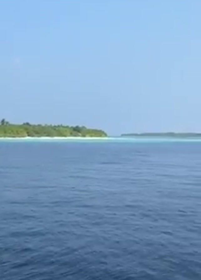 view of the ocean with two islands in the distance. The water is deep blue and slightly choppy. The islands appear to have sandy beaches and are covered in lush green vegetation. The sky is clear and light blue.