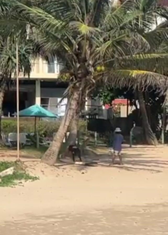 sandy beach on a sunny day. Several palm trees are visible. A person wearing a hat and dark clothing is walking towards a coconut tree. Under the tree, a black dog is present. In the background, a multi-story building with a green umbrella in front of it is visible. The building appears to be a hotel or resort.