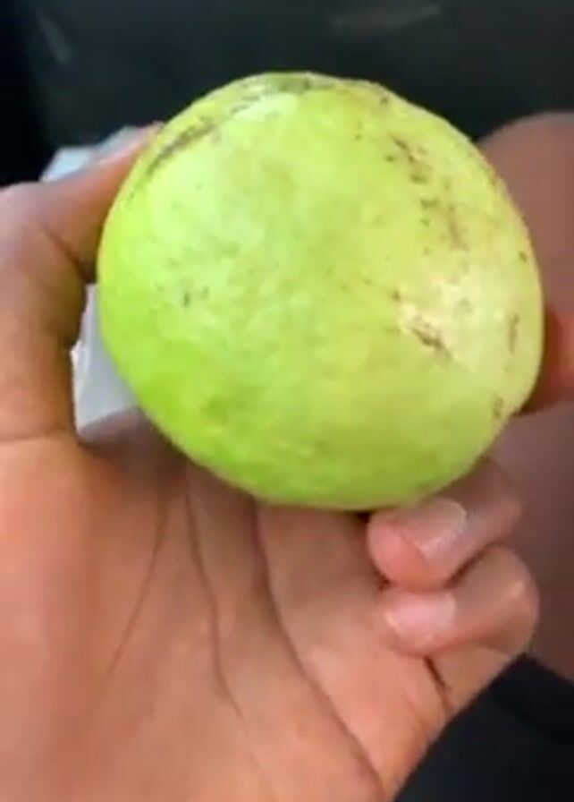 A hand holds a green guava, then splits it in half, revealing a pale pink interior. The hand is dark-skinned, and a person is wearing black shorts. A white plastic bag sits on the person's lap. The person appears to be sitting in a car.