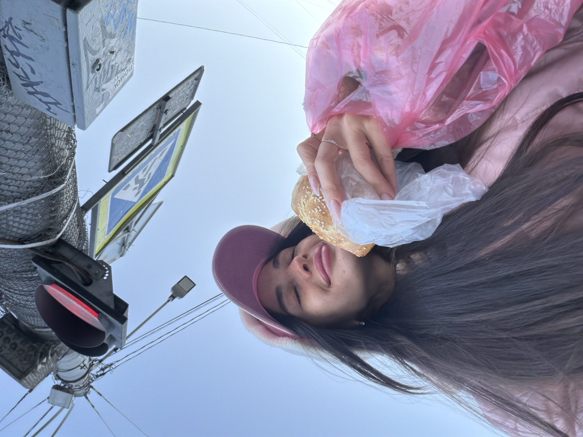 A woman wearing a pink coat and a pink cap with rabbit ears holds a sesame seed bun in a plastic bag. She is standing under a pedestrian crossing sign, traffic light, and street light. The scene appears to be in Saint Petersburg, Russia, based on the road signage.