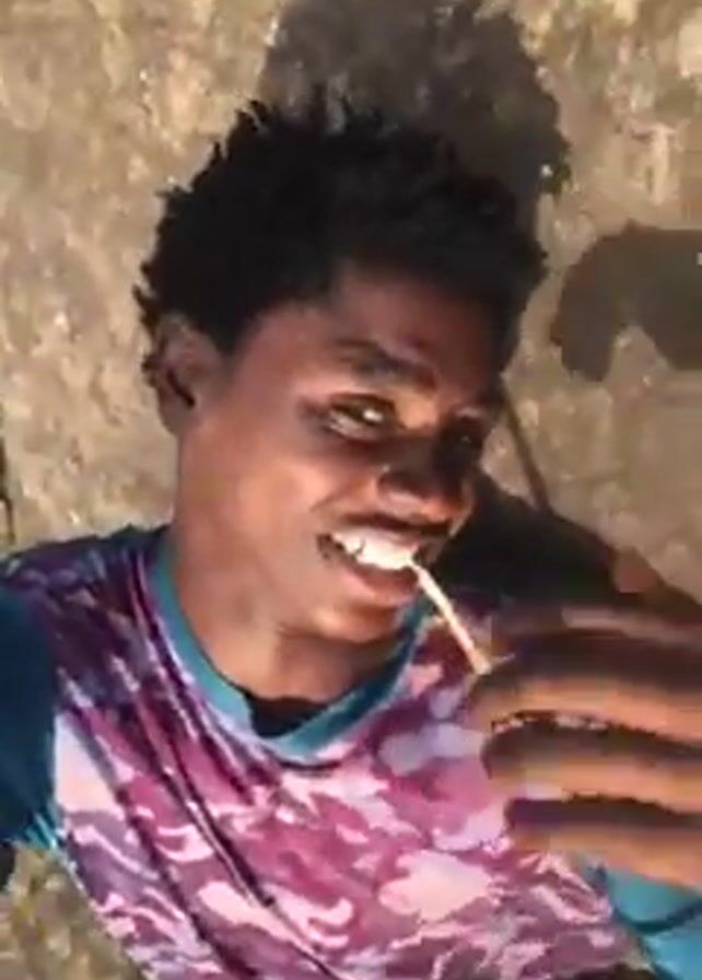 A young, dark-skinned male is lying on concrete in the sun. He has a toothpick or twig in his mouth, and he grins and gurns while looking at the camera. He is wearing a shirt with blue sleeves and a purple camouflage pattern on the body. There is a shadow from a tree branch to his right.