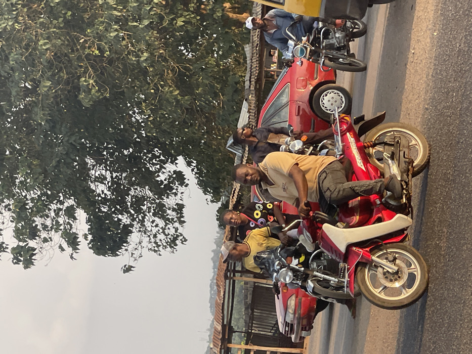 Several people on motorcycles are in the street. One person in a tan shirt on a red motorcycle looks at the camera. Another person is behind them with a colorful shirt. A few cars and a tree are in the background.