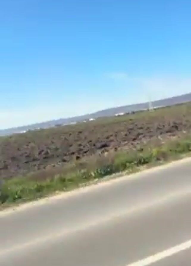 first-person perspective from a scooter. The view pans across a field of dark soil under a clear blue sky. Later, the camera focuses on a fenced area containing parked cars and construction equipment.