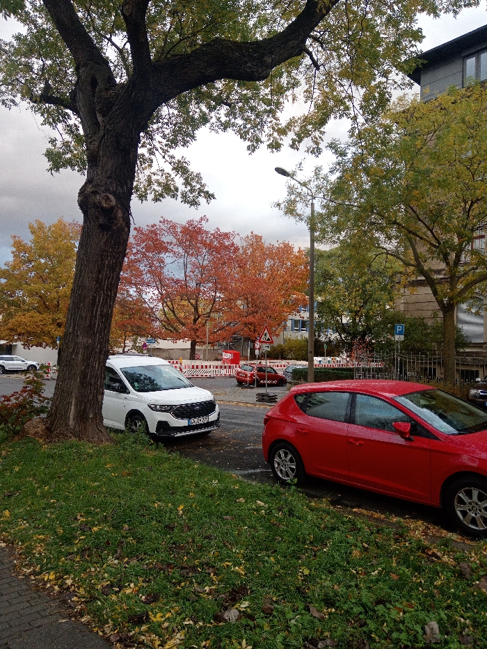 This image captures an urban street scene in Dresden, Germany, during autumn under an overcast sky. The foreground presents a large, dark-bbarked tree with green and yellowing leaves on the left, next to a strip of green grass dotted with fallen yellow and brown leaves, bordering a paved sidewalk at the bottom left. In the midground, a white Ford Transit Connect or similar commercial van (license plate "DD C 723") is parked facing right, partially obscured by the tree. To its right, a red SEAT Leon hatchback is parked facing left, with its front out of frame. Both vehicles rest on an asphalt surface. Behind the vehicles, a section of the road is cordoned off by white and red barriers, indicating a construction or maintenance area, within which a red container or skip is visible, along with a triangular warning sign depicting two pedestrians. A black street lamp pole stands upright on the right side of this area, and a blue square "P" parking sign is visible further right. The background consists of several deciduous trees exhibiting vibrant orange and yellow autumn foliage, interspersed with multi-story buildings, including one with a grey facade and large windows on the far right. No individuals are present in the scene.