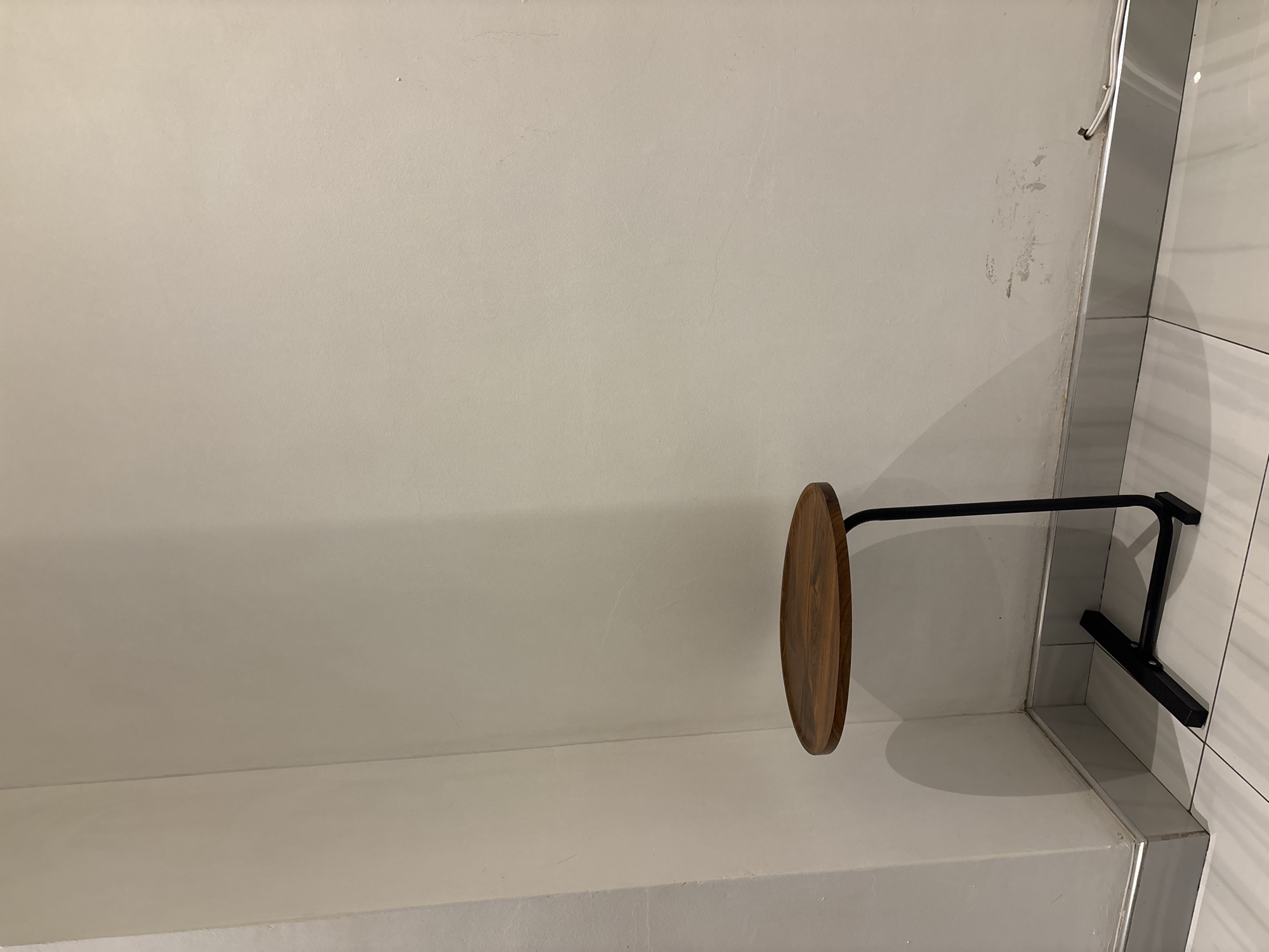 small, round, wooden table with a black metal base. The table is positioned against a white wall, next to a tiled wall with a silver trim. The lighting appears to be artificial. The location is not discernible from the image. There are no people visible in the image.