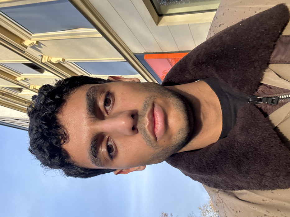 The image depicts a close-up portrait of an adult male situated outdoors in Neuilly-sur-Seine, France. The subject, positioned centrally, has dark, curly hair, dark eyes, and light stubble on his face. He is wearing a light brown jacket featuring a dark brown, possibly faux fur, collar over a dark (likely black) t-shirt, with a visible metal zipper pull. He maintains a direct gaze towards the camera. The background consists of a clear, light blue sky on the left, with faint tree branches visible at the lower left. On the right, a multi-story, light-colored building with architectural details is visible. The building features several reflective windows, mirroring the sky, and an illuminated orange/red rectangular sign or facade element is present on a lower section of the building. The scene is illuminated by natural daylight.