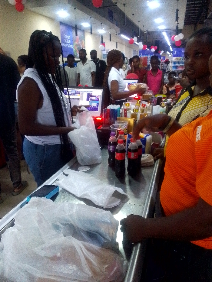 The image depicts a busy checkout area within a brightly lit retail store in the city of Unknown, Unknown. In the foreground, a woman with dark braids, wearing a white sleeveless top and blue jeans, stands at a metallic counter, actively placing items into a translucent white plastic bag. To her left, a black smartphone in a blue case rests on the counter. Multiple plastic bottles of soda, including several with red Coca-Cola labels and two with purple labels, are visible on the counter, alongside other small packaged goods and additional plastic bags. Behind the woman, a computer monitor displays a point-of-sale interface with a red scanner light below it. Further right, partially obscured individuals, including a person in a yellow and black patterned top and another in an orange striped shirt, are also present at the counter. In the mid-ground and background, several other individuals, mostly adults and a young girl in a pink shirt, are standing, observing or waiting. The store's interior features a white ceiling with multiple lights, and red and white balloons are strung overhead, indicative of a special event. A blue sign in the background reads "Fresh value everyday."