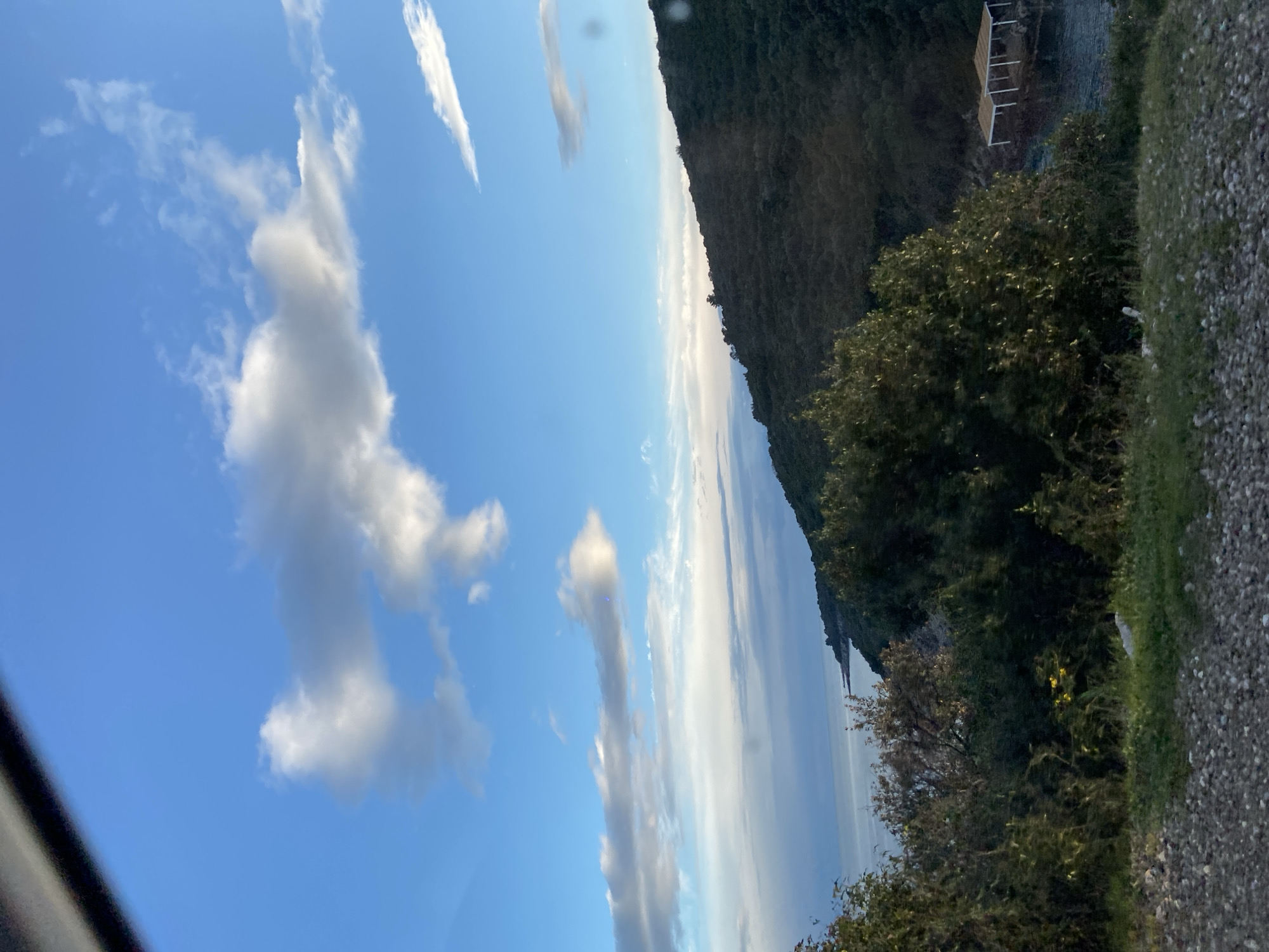 view from Dubraljevina, Montenegro. The sky is blue with scattered white cumulus clouds. To the right, a mountainside is visible, covered in dense green vegetation. A small structure with white railings is present on the mountain. The ground is gravel. The body of water is visible in the distance.