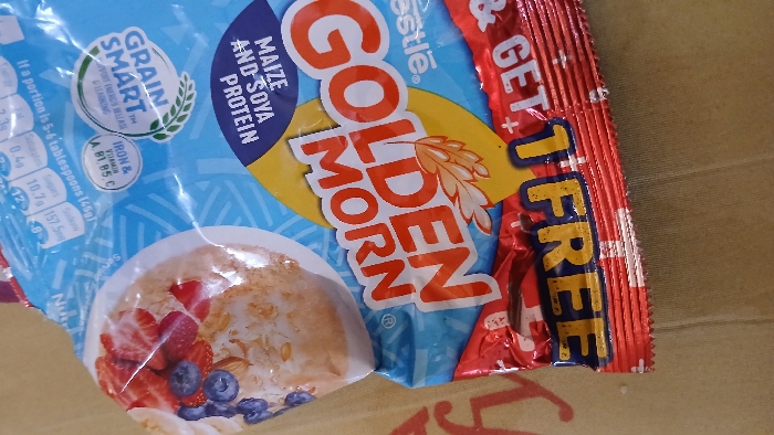 - "The image displays a slightly angled, close-up view of a Nestle Golden Morn food product package, positioned in Isasi, Nigeria" by FM-kuE8L2, licensed under CC BY 4.0