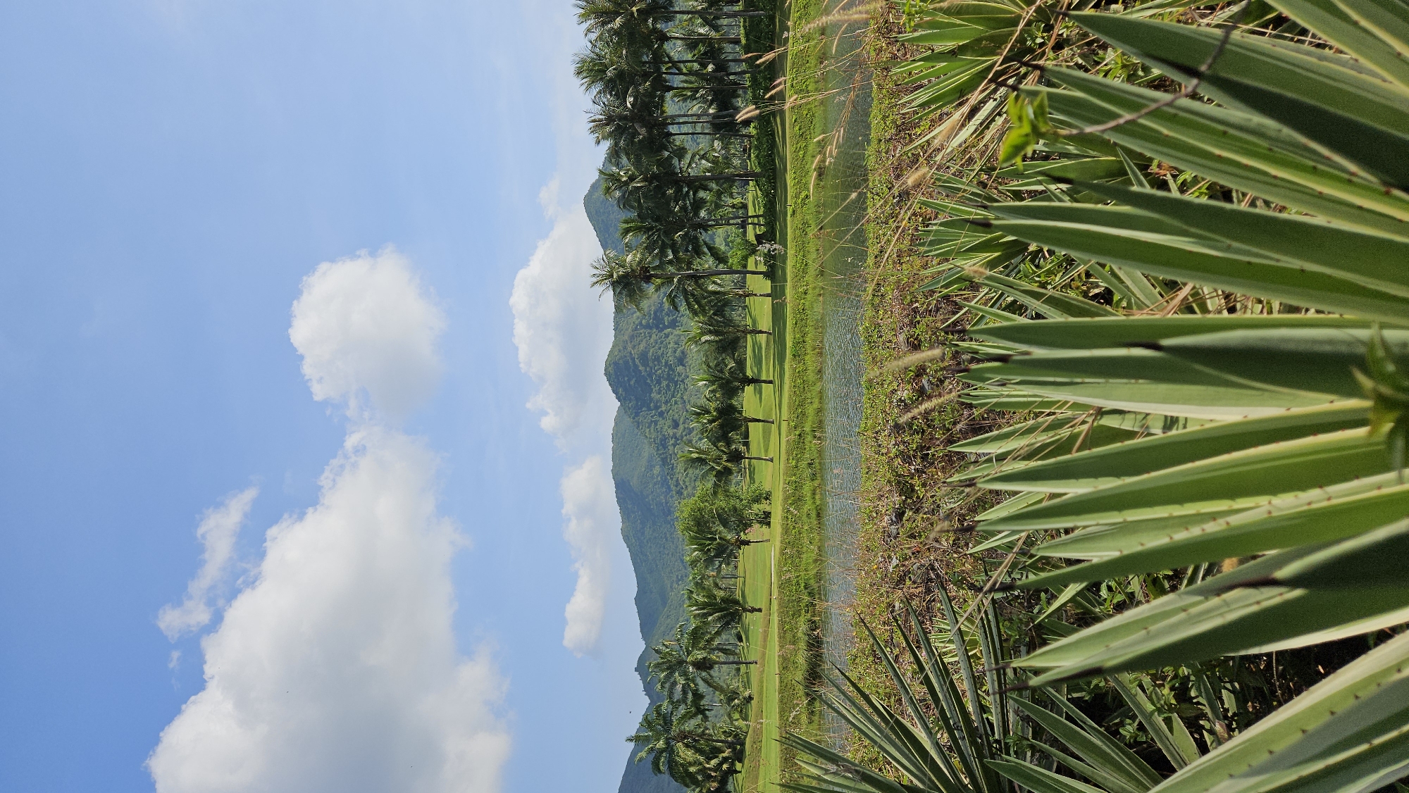The image depicts a landscape featuring a mountain range in the background, palm trees, a narrow body of water, green grass, and spiky plants in the foreground
