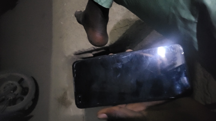 A dark-skinned person sits with a black mobile phone held in one hand. The phone screen is dark with some glare. A bare foot is visible, hovering slightly above the top edge of the phone. A glimpse of what may be a wheel or some other round object is present near the left edge. The surface under the wheel and the phone appears to be either a rough, light-colored wall or the ground. The person is wearing green or grey clothing.